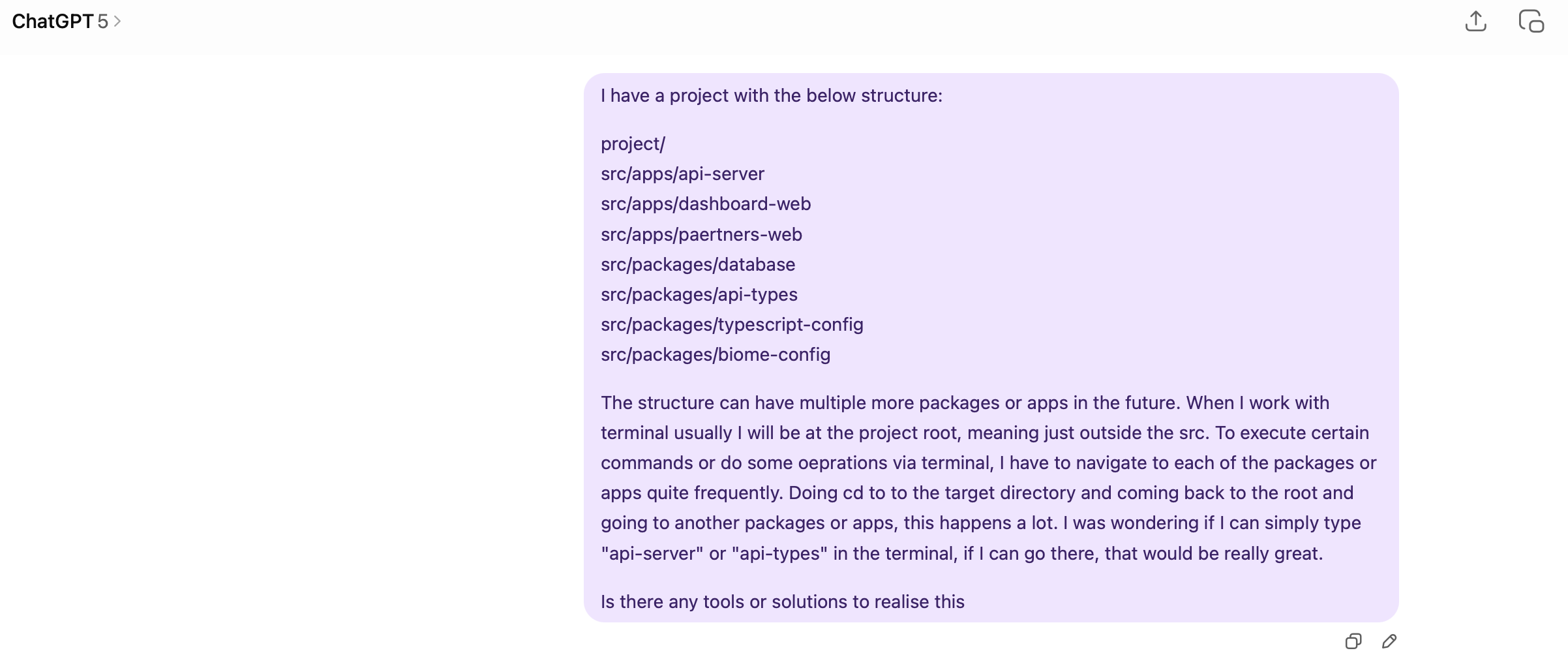 Now, whenever I am working in the mono-repo, I can bounce between apps and packages without breaking my flow. Turbo handles the big stuff like running commands across packages, and zoxide helps me move around quickly at the shell level. Together, they make the workflow feel smooth and efficient โจ while also keeping my hands from filing an HR complaint ๐ .