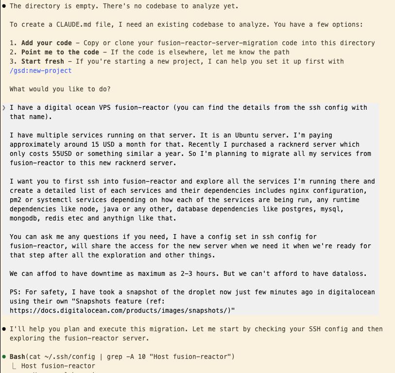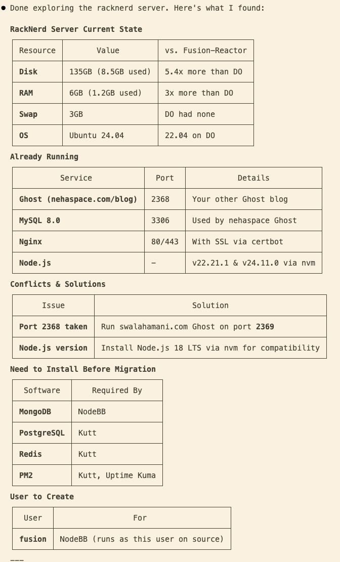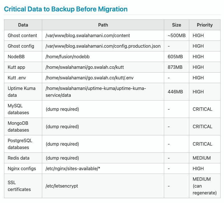 Claude started by SSH-ing into my source server. Within minutes, it had documented everything I had running. System resources, active services, runtime dependencies, and user permissions. It even identified what data was critical to back up and assessed the risk level of each component.