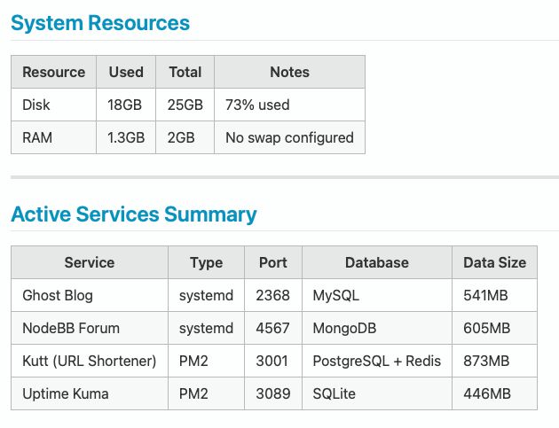 I had four services running: my Ghost blog, a NodeBB forum for my knowledge base, Kutt.it for URL shortening, and Uptime Kuma for monitoring. Each had its own database. MySQL, MongoDB, PostgreSQL, and SQLite, respectively. Plus Redis for caching.